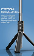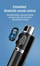 - 2-in-1 tripod and selfie stick with a detachable Bluetooth enabled remote control